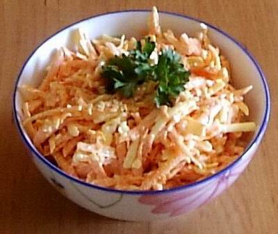 Тертая на крупной терке сырая морковка, столько же тертой брынзы и измельченный чеснок.