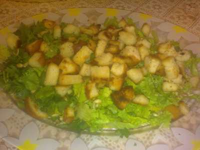 Порезать белый хлеб кубиками, обжарить их на сковороде с подсолнечным маслом. В конце обжарки добавить мелко порезанный чеснок и перец чили