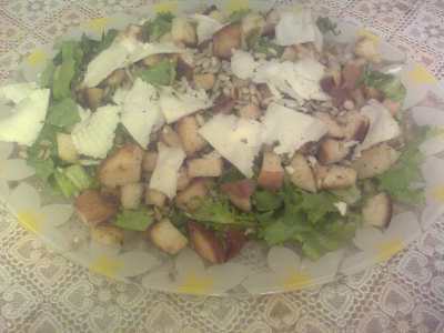 Выложить на плоское блюдо часть нарезанного салата, щедро посыпать семечками с орехами.
