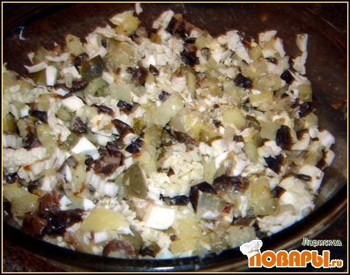 Все перемешать в салатнице, добавить грибы и лук.