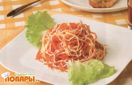 Морковь также нашинкуйте длинной тонкой соломкой (лучше использовать для этого специальную терку). Сыр натрите на терке, чеснок измельчите. Подготовленные ингредиенты соедините, заправьте майонезом.