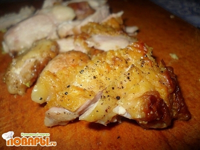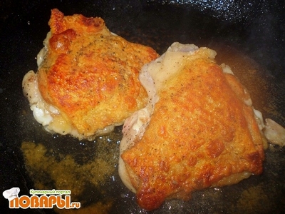 Бедро курицы необходимо посолить и поперчить. Разогреть сковородку и поджарить на растительном масле до золотистой корочки.