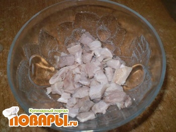 Куриное иле нужно отварить и порезать не большими кусочками, выложить на дно тарелки и перемазать майонезом,