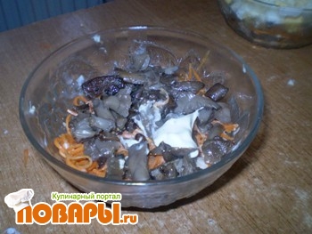 Сверху положить шар моркови по- корейски, и чем острее она будет, тем лучше, и опять перемазать майонезом,