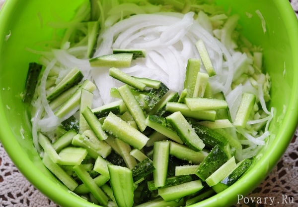 Для этого салата можно использовать лук, лучше сладкий. Или вообще лучше не класть. Лук нужно порезать очень тонко, полукольцами.