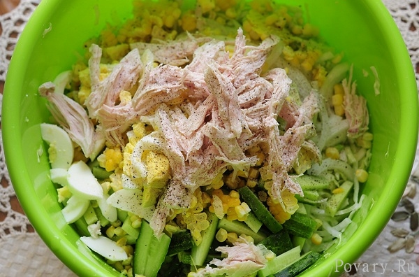 Салат у нас диетический, поэтому мы будем заправлять его маслом подсолнечным, кукурузным или еще вкуснее маслом из грецкого ореха. Скажу вам по секрету с майонезам такой салат вкуснее, но майонез содержит много калорий. Именно поэтому я добавляю в салат немного тертого сыра, например пармезана или овечьего. Ну и конечно не забудьте черный перец по вкусу.