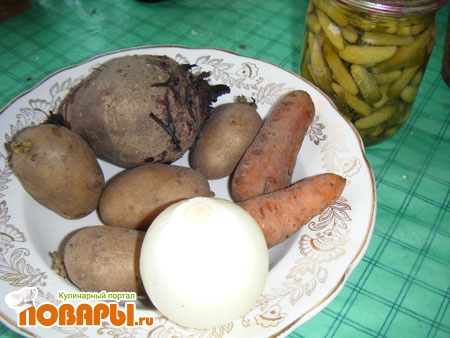На терке трем отваренные овощи: свеклу, морковь и картофель. Трем или мелко режем (как вам больше по вкусу) маринованные огурцы. Смешиваем в однородную массу.