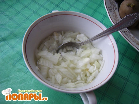 Нарезаем мелко головку лука, обдаем кипятком и заливаем маринадом: 1 ч. л. соли, 1 ч. л. сахара и немного уксуса.