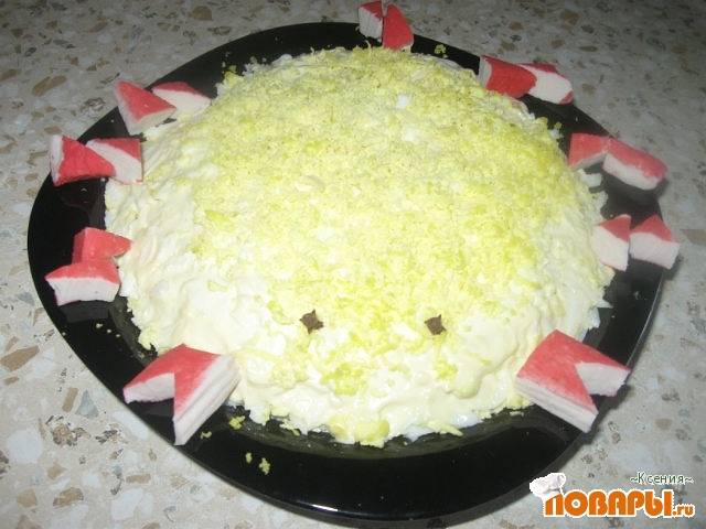 Выкладываем салат слоями: рыба, лук, крабовые палочки, яйца. Каждый слой промазать майонезом, слой лука можно поперчить.
