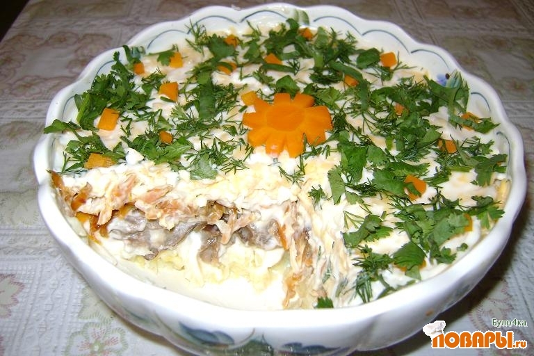Все ингредиенты выкладывать слоями и промазывать майонезом.