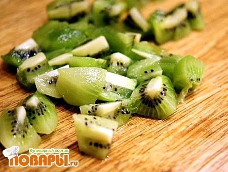Киви нам понадобятся среднего размера, лучше взять немного плотные, чтобы они не развалились в салате. Киви почистить, промыть и порезать так же кубиками 3 на 3 см.