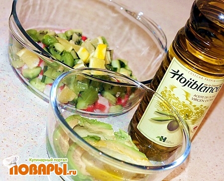 Крабовые палочки, огурцы и порезанные кубики и лимон соединим в отдельной чашки.