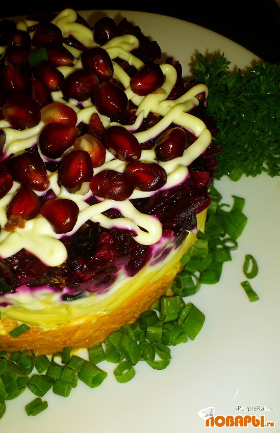 Слои: Горсть изюма (разбросать), затем выложить потертую морковь, покрыть хорошим слоем майонеза, перемешанного с чесноком. Слой потертого сыра и майонез. Последний слой свекла. На свеклу выложить чернослив, орехи, гранат и украсить майонезом.