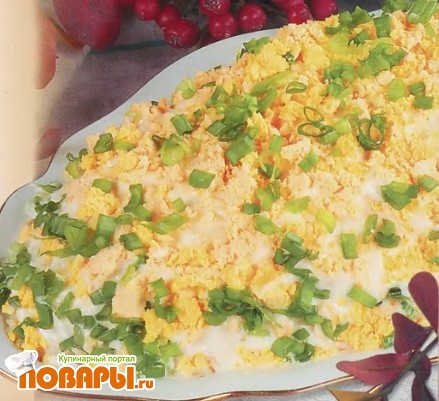 В стеклянной салатнице чередовать слои рыбы, яиц, моркови, лука и картофеля, тонко смазывая каждый слой майонезом.