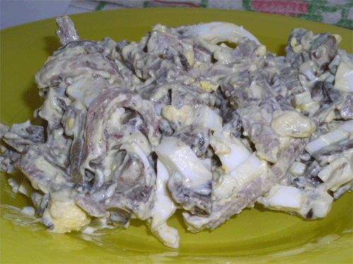 Язык отварить, снять шкуру, и нарезать соломкой (для салата нужно брать маленький язык), шампиньоны обжарить с луком. Яйца порезать соломкой. Все смешать и заправить майонезом.