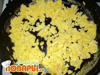 Сначала готовим омлет из яиц, с добавлением молока и соли. Толкушкой разминаем его до небольших кусочков и даем остыть.