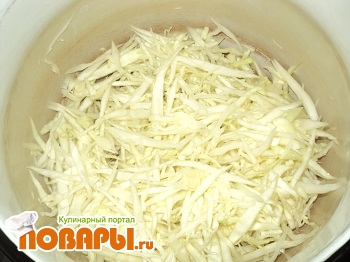 Затем мелко шинкуем капусту, солим ее и хорошо разминаем руками, чтобы выделился сок. Даем немного постоять.