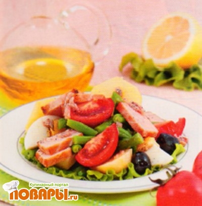 Разложить листья салата на порционных тарелках, сверху красиво выложить остальные компоненты. Смешать ингредиенты для соуса и полить им приготовленный салат. Украсить маслинами.