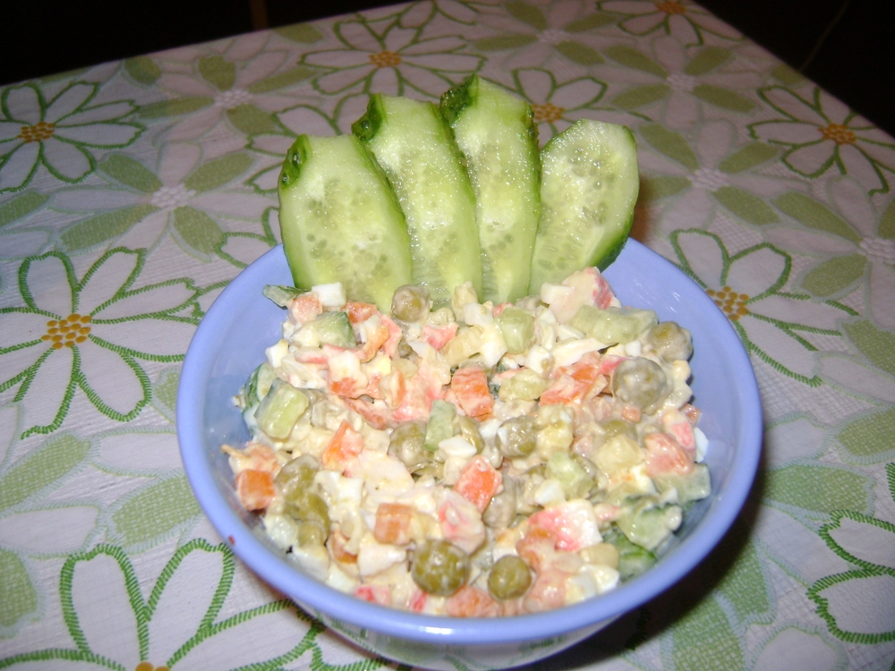Все ингредиенты нарезаем кубиками и заправляем майонезом.