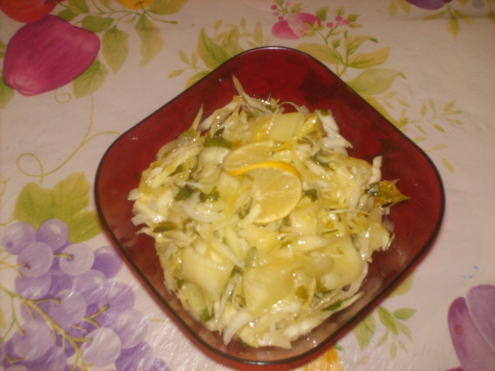 Чистим лук и нарезаем тонкими полукольцами и отправляем к капусте с кабачком, аккуратно все перемешиваем.
