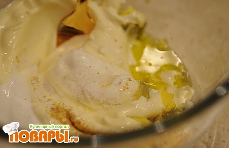Смешаем ингредиенты: желтки от яиц, майонез, сметана, горчица, оливковое масло, соль и черные перец по желанию. Хорошо перемешать, яйца должны быть покрошенными.
