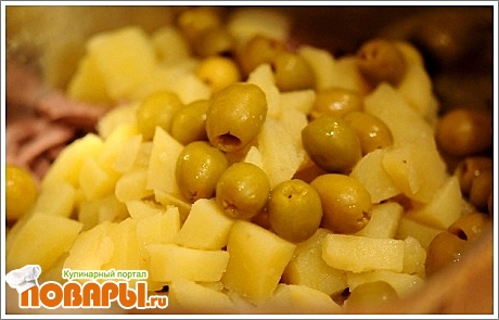 Теперь соединим все ингредиенты: Огурцы порезанные, язык порезанный, картофель порезанный, оливки целые (ели крупные порезать на 2 части), сыр тертый.