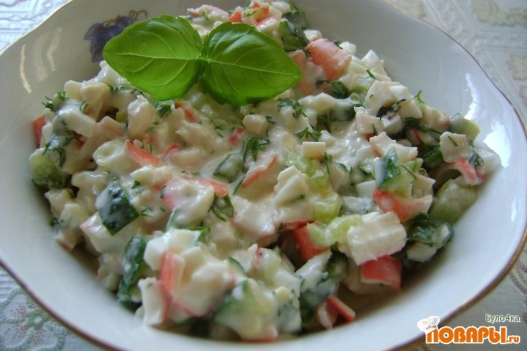 Крабовые палочки, огурец, яйца нарезать кубиками. Добавить тертый сыр, зелень. Заправить майонезом.