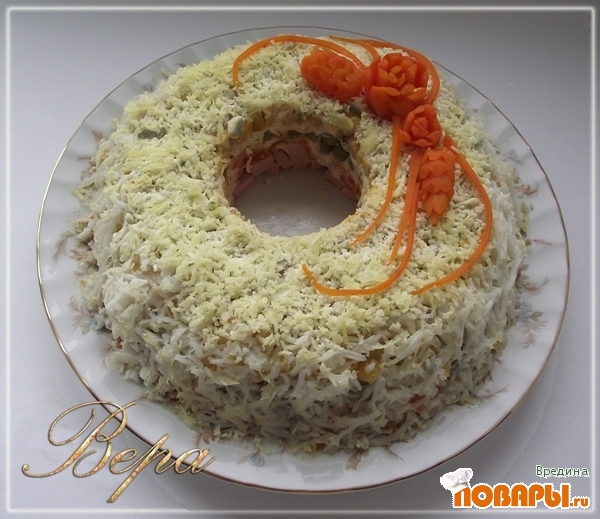 Салат укладывается на блюдо, вокруг стакана, слоями, промазывая заправкой.