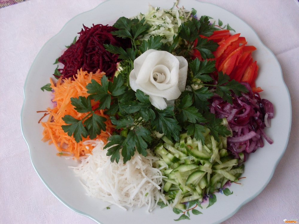 Фиолетовый лук заранее замариновать (соль, сахар,уксус) Все по отдельности выложить на блюдо, в центр положить майонез и зелень. Перемешать салат уже на столе.