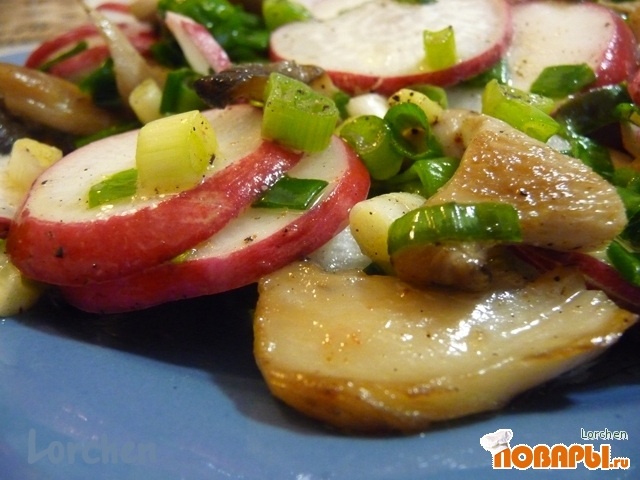 Грибы порезать полосками, обжарить на растительном масле. Добавить вместе с маслом к редису и луку.