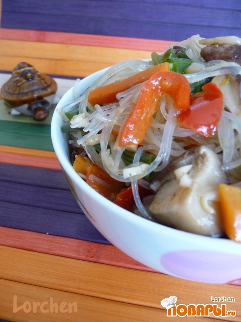 Фунчозу залить кипятком и оставить на 2 минуты. Промыть холодной водой.