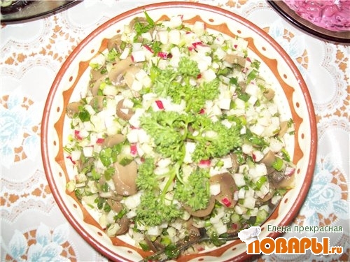Огурцы и редис нарезать мелким кубиком.Шампиньоны -нарезаные вдоль и обжареные+ рубленая зелень. Заправить соль+черный перец-сок лимона(одного)+масло растит+тмин(растертый в ступке или скалкой на твердой поверхности).