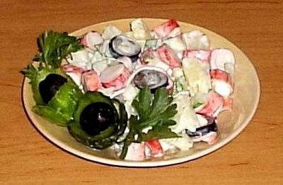 Перед подачей приготовить соус - 2 ст. л. йогурта, 1 ч. л. готовой горчицы, зубчик чеснока, 1 ст. л. ананасового сока. Соус жидковатый, поэтому заправляйте салат прямо в тарелках.