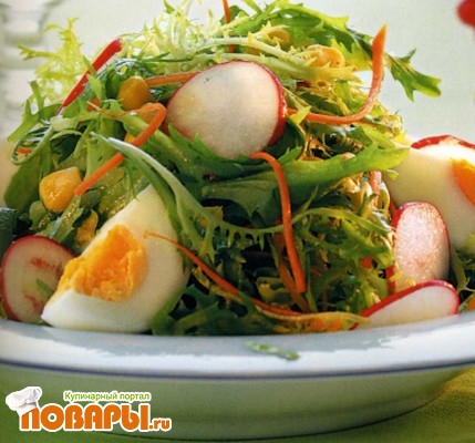 В салатницу выложить листья салата, сверху положить морковь, кукурузу, редис. Все перемешать.