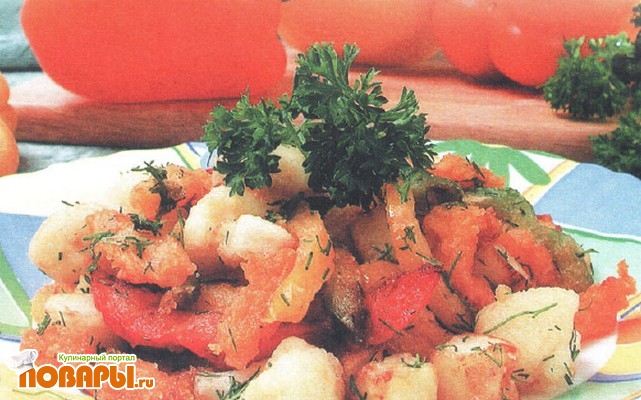 Айву и перец обжаривают в оставшемся масле, охлаждают, соединяют с тыквой и капустой, добавляют соль и перемешивают.