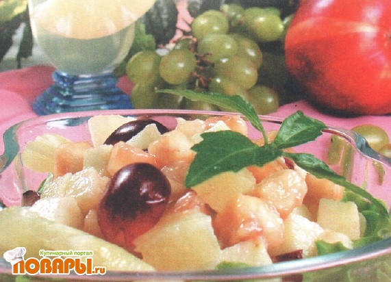 Ананас, бананы и яблоки нарезают кубиками, добавляют ягоды винограда.