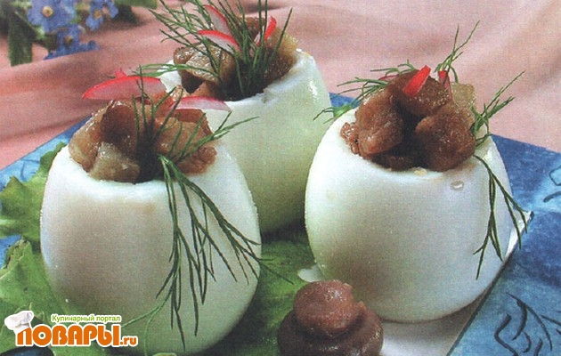 Готовым салатом наполняют белки вареных яиц.