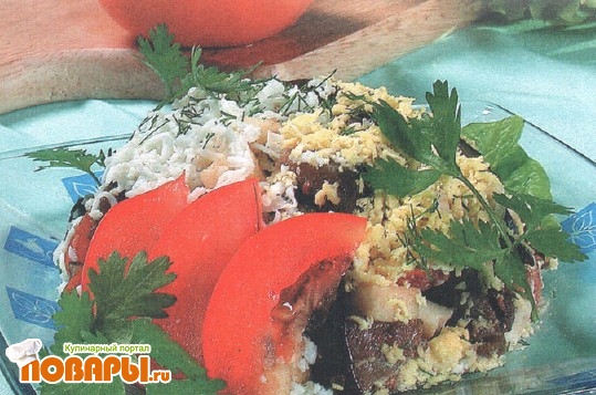 Оформляют салат помидорами и зеленью.