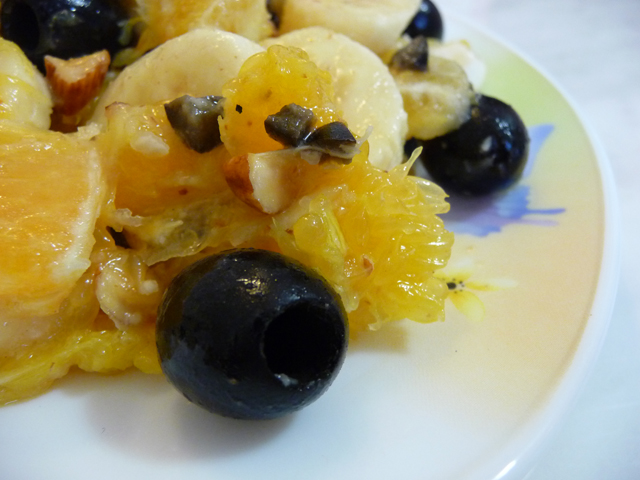 Апельсины очистить от кожуры и белой пленки, разделить на дольки. Соединить бананы с апельсинами, добавить целые маслины, добавить заправку и перемешать.