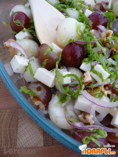 Из дыни при помощи ложки для фруктов вырезать небольшие шарики (если ложки нет - нарезать небольшими кубиками).