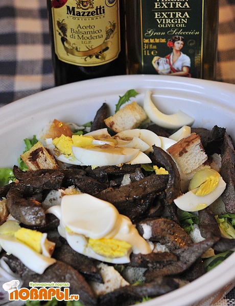 Листья салата выложить в общую посуду, по желанию можно дополнительно опрыскать их бальзамическим уксусом, а так же оливковым маслом.
