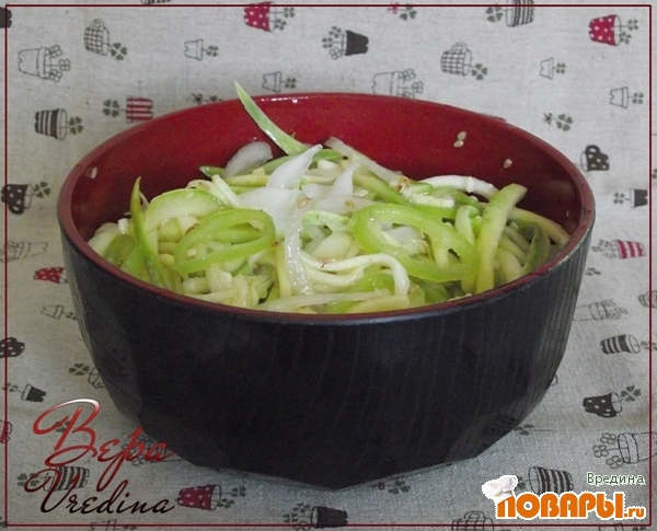 Кабачки тонко нарезать вдоль (пластинками) и нашинковать соломкой.