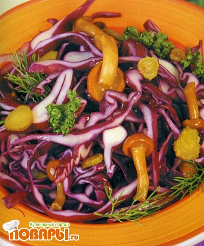 Капусту перемешать с огурцами, опятами, заправить растительным маслом.