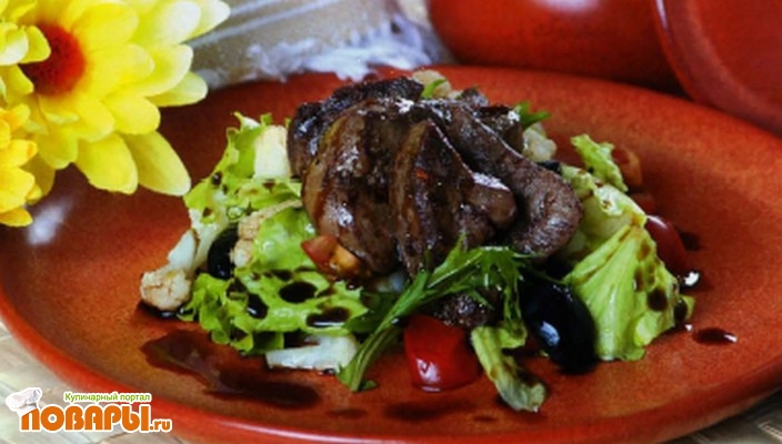 Подготовленные продукты соединить, по вкусу посолить и поперчить, заправить соусом. Куриную печень промыть, обсушить, нарезать небольшими кусочками, обжарить на сливочном масле до полуготовности. По вкусу посолить и поперчить, полить соусом и тушить на слабом огне еще 1-2 минуты, до готовности. Салат выложить горкой на тарелку, сверху уложить горячие кусочки печени, украсить зеленью и подавать