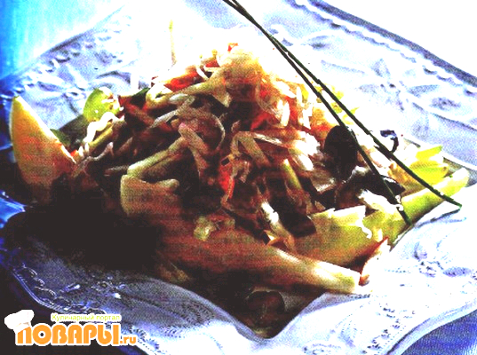 Капусту отожмите и нашинкуйте кусочками длиной 3-4 см. Сложите все в миску и перемешайте.