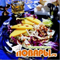 Тщательно смешать мед, горчицу и уксус, добавить соль и перец. Непрерывно размешивая, постепенно влить оливковое масло. Листья салата порвать руками на небольшие куски и разложить (в качестве "ложа") по тарелкам.
