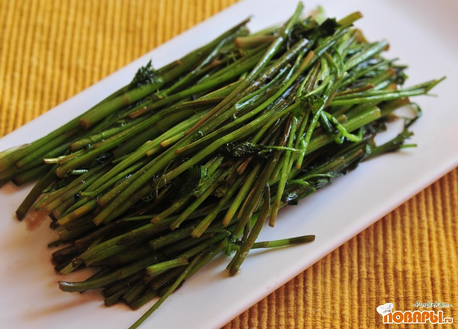 Несложный и вкусный рецепт салата из стеблей зелени с заправкой из соевого соуса и меда.