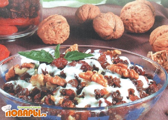 Фрукты выкладывают слоями в салатник, пересыпая каждый слой орехами, и заливают сметаной, взбитой с сахаром.