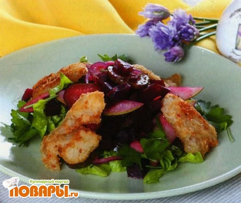 Салат выложить горкой на тарелку сверху уложить горячие кусочки рыбы, украсить зеленью петрушки.