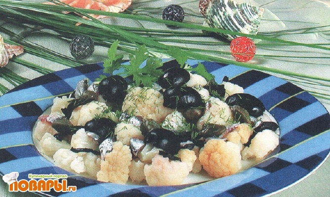 Смешивают цветную капусту и анчоусы, оформляют маслинами и каперсами.
